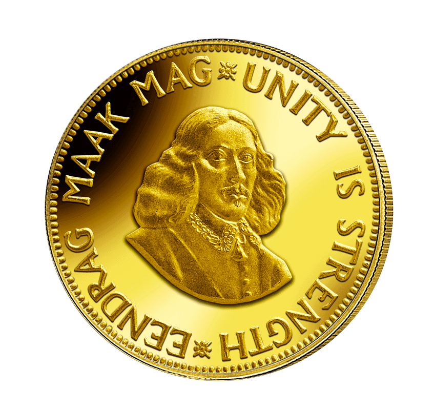 Aus dem Land des Krügerrand: Die ersten Rand-Goldmünzen der Republik Südafrika. Das gemeinsame Vorderseiten-Motiv der 1 Rand und 2 Rand Goldmünze zeigt Jan van Riebeeck, den Gründer von Kapstadt.